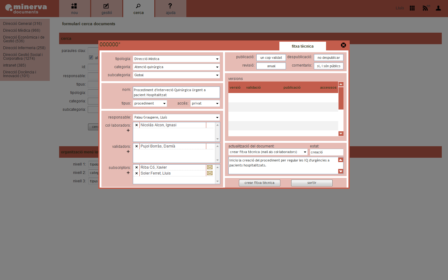 Amb minerva tindràs controlats els teus documents per estats, des de la seva creació per part del responsable, el control de les versions tant esborrany com definitives ,l’edició per part dels col·laboradors, l’aprovació dels validadors, la publicació i l’actualització i revisió periòdica del mateix.
